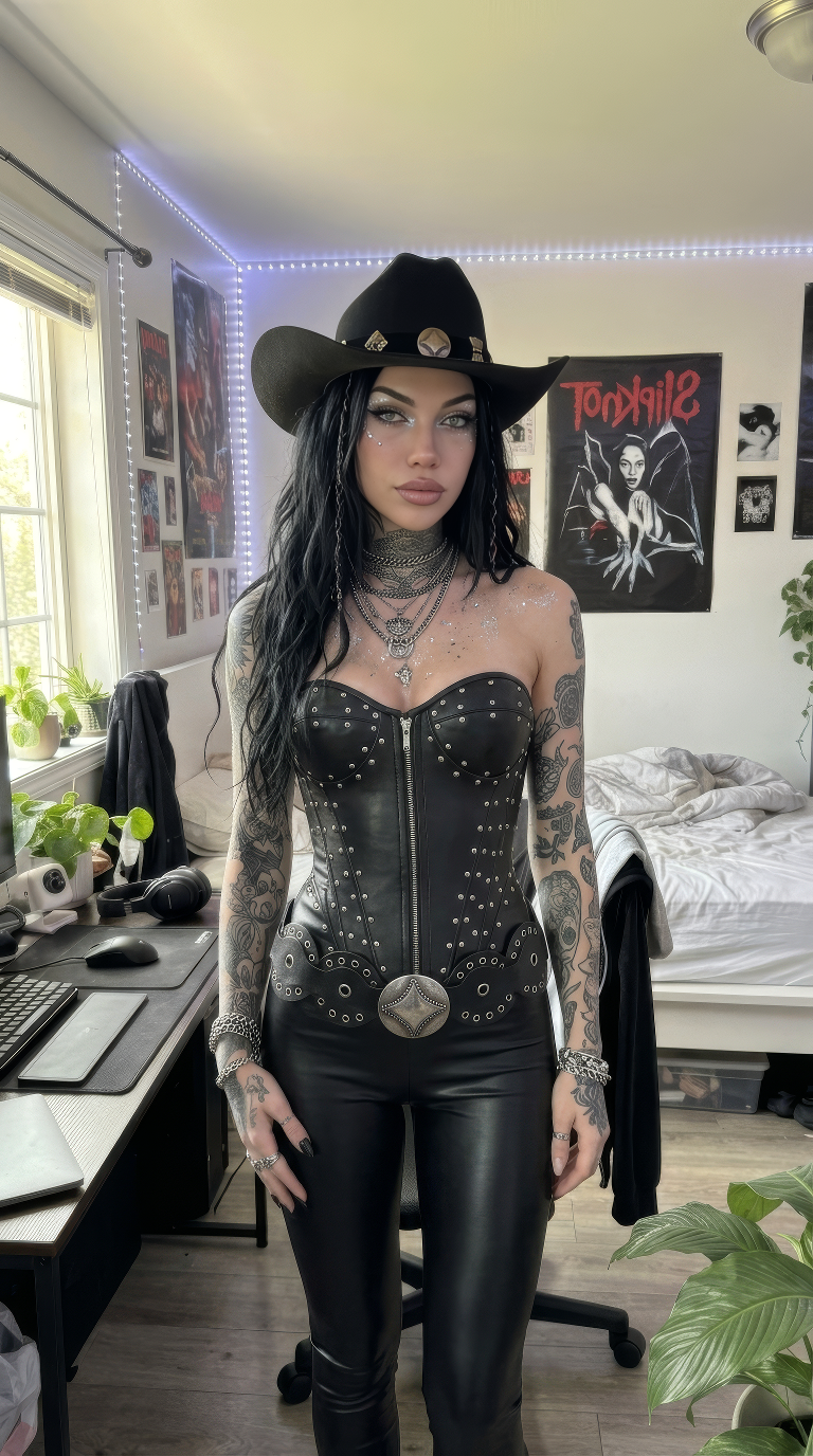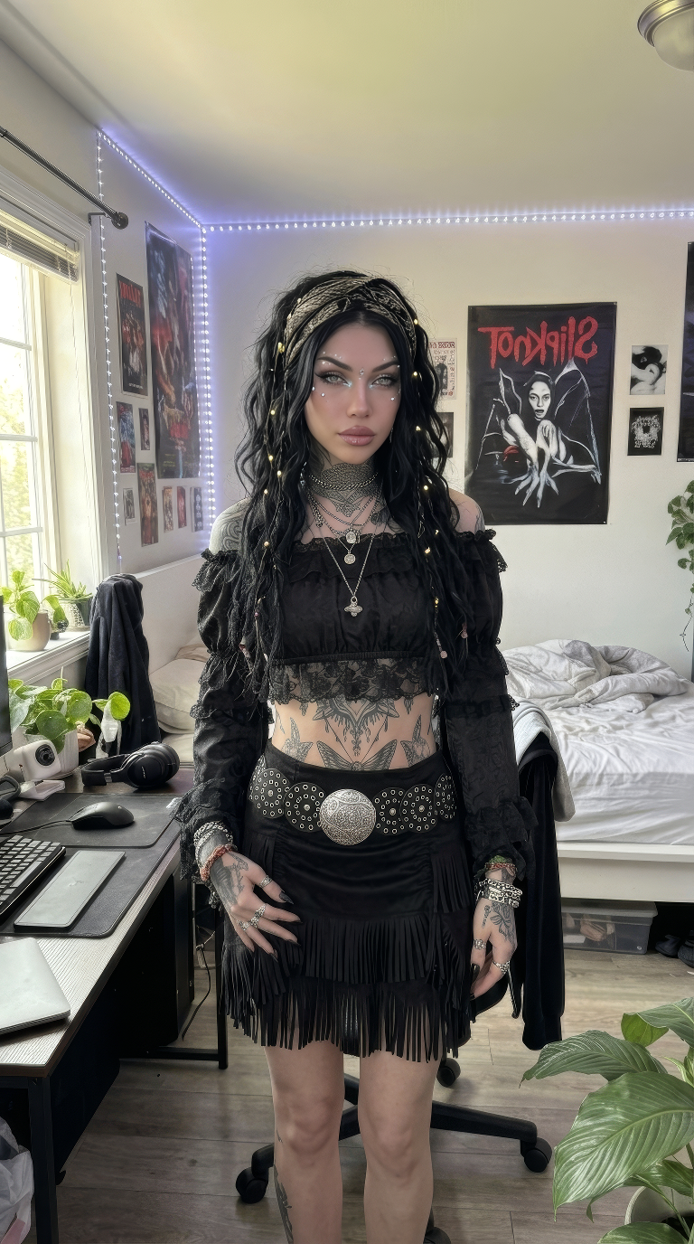 For a bold, alternative take on Coachella fashion, this look leans into a dark western aesthetic.